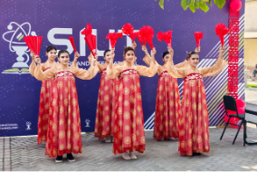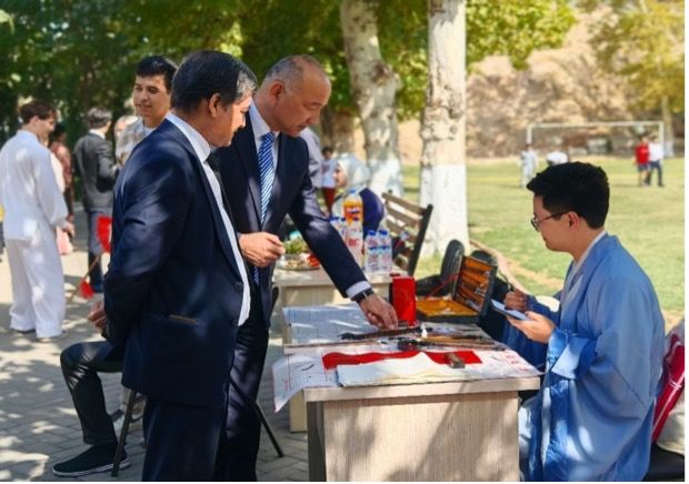 活动现场精彩纷呈,文艺表演与文化体验活动同步进行。开场舞《驼铃绎梦》生动再现了丝绸之路文化交融的盛况,《华月正当时》朗诵传递了中外学子携手共进的美好愿景,古筝独奏、独舞《扇影剑竹》、太极表演、茶艺与舞龙等节目依次上演,群舞更是将现场氛围推向了高潮;书法体验、月饼品尝、投壶游戏等展区让中乌师生深度互动,在亲身参与中深刻感受中秋文化的魅力,进一步加深了对中华传统文化的理解与喜爱。